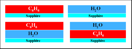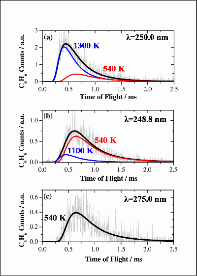 Photon stimulated desorption of hot molecules from interstellar ices![]() ![]() In these experiments, a sapphire substrate was used in order to facilitate cooling to cryogenic temperatures (80-100 K), whilst eliminating and metal-mediated effects that would not be relevant in an interstellar environment. The water and benzene layered ices were produced by backfilling the chamber to 10-7 mbar for 500s, a dose of 200 L. Such a dose however produce a much thinner film on benzene than water due to the differences in sticking probabilities and ion gauage sensitivities. The systems are illustrated in Figure 3. Following adsorption the ices were irradiated with photons at 2 pulse energies of 1.1 mJ and 1.8 mJ. Thre wavelengths were used, 250 nm is on-resonance with a vibronic transition in the benzene 1B2u <-- 1A1g , whilst 248.8 nm (near-resonance) is in a minimum. 275 nm was used as an off-resonance reference. The irradation time was 60 s with a pulse length of ~10 ns and a frequency of 10 Hz. Desorbed benzene and water was detected by monitoring the 78 amu and 18 amu mass channels respectively. TOF profiles were averaged over 30 spots on the sample surface. ![]() Figure 4 shows ToF profiles for benzene and water following irradiation with UV photons on resonance with the benzene absorption (250.0 nm). The left hand panel demonstrates the effect of layer configuration. It is clear that when a cap of water is present over the benzene layer, the desorption of benzene is inhibited. A small amount of benzene is observed to desorb when benzene is not present, indicating that a substrate mediated desorption channel involving absorption by the sapphire is also in operation. The amount of water desorbed is increased when benzene is present, which suggests an energy transfer mechanism between the benzene and the water. The right hand panel illustrates the dependence of the observed desorptions on laser pulse energy. The amount of both benzene and water desorbed increases broadly in proportion with the laser pulse energy. This is indicates that single photon processes are responsible for the desorption of both benzene and water. This is important, as the effect of multiphoton processes in the ISM is negligable due to the low photon flux. ![]() Figure 4. (Right Hand Panel): ToF profiles for (a) C6H6 and (b)H2O (wavelength=250.0 nm). Desorption is from the Al2O3/H2O/C6H6 system. Red (blue) lines correspond to a laser pulse energy of 1.1 mJ (1.8 mJ) Figure 5 shows 4th order Maxwell-Boltzmann fits to the benzene ToF profiles. The profiles are compared for the three wavelengths used in these experiments. The slow component observed off-resonance (c) is attributed to substrate mediated desorption. This component has been fixed at 540 K for fitting at the other two wavelengths. The two component fitting for C6H6 at (a) 250.0 nm shows a much more intense, faster component with a temperature of around 1300 K. This can be attributed to desorption following resonant absorption by the C6H6 molecules. At the near-resonance wavelength (b) 248.8 nm desorption appears to be dominated by the substrate mediated component, with a small, fast resonant desorption component. For both components the molecular temperatures are greatly elevated with respect to the substrate temperature – i.e. desorption of hot molecules. The desorption of H2O can also be fitted with distributions having T~400 K, also indicating the desorption of hot molecules. ![]() The desorption characteristics are likely related to the morphology of the ice, and future experiments will aim to study more realistic ice mixtures. A fuller investigation of the power dependence is also required in order to be certain of the absence of multiphoton processes. Alternative substrates will also be investigated to eliminate the substrate mediated desorption channel. It will also be important to extend this work to the study of PAHs themselves and it is anticipated that a study of electron stimulated processes in these systems will be conducted. |